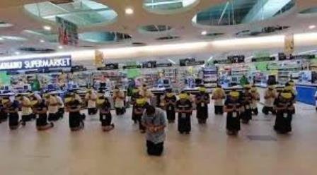 Trabajadores de un supermercado en Filipinas, oraron de rodillas antes de comenzar su jornada de trabajo. Suplicaron a Dios por protección y por el fin del coronavirus en el país.