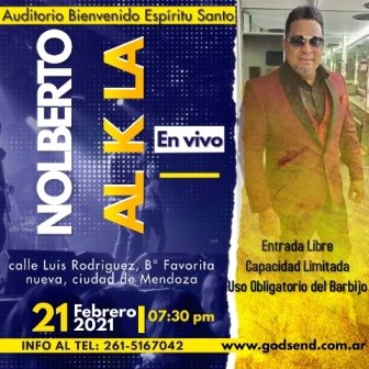 Este domingo 21 de Febrero de 2021, el prestigioso cantante Nolberto Alkla, estará adorando al padre celestial por primera vez en el Auditorio Bienvenido Espíritu Santo, ubicado en calle Luis Rodríguez del Barrio La Favorita nueva de la ciudad de Mendoza, la cita es a partir de las 19:45, no podes faltar, capacidad limitada, entrada libre, uso obligatorio del barbijo.