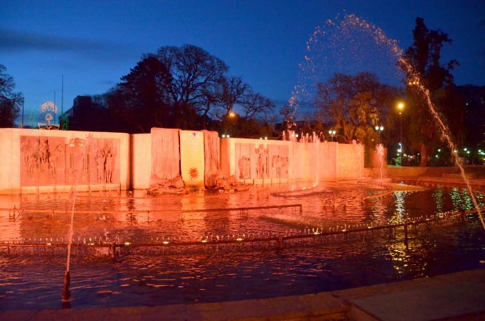A consecuencia de ello, y si bien se concluyó con el nuevo trazado de la plaza, se postergaron la pavimentación, el alumbrado, los juegos de agua proyectados y otros elementos decorativos, siendo el principal de estos el destinado a cubrir el gran muro que cierra por el este el salón construido en el centro de la plaza.