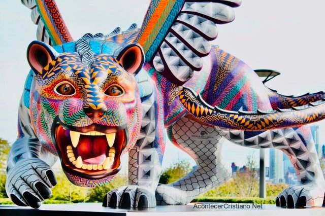 El guardián, que se instaló fuera de la ONU, fue donado por el gobierno de Oaxaca, México. El monumento es un “alebrije”, un tipo de artesanía popular en México.