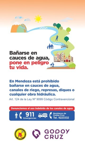 Es importante recordar que en Mendoza está prohibido bañarse en cauces de agua, canales de riego, represas, diques o cualquier obra hidráulica (Art.124 de la Ley 9099 – código contravencional).